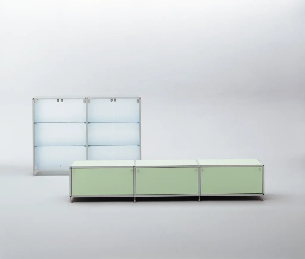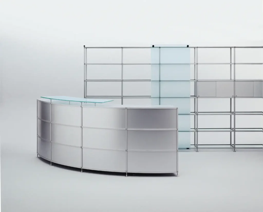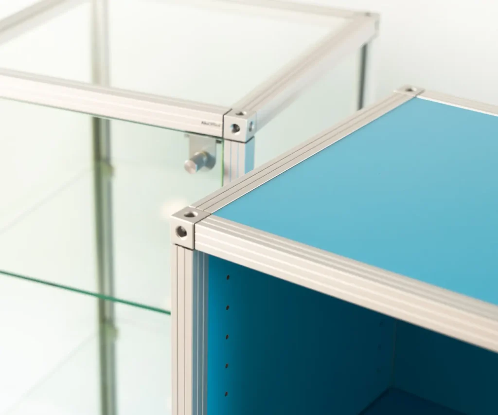 Ein flexibles Möbelsystem für Innenausbau, Büro, Praxis, Ladenbau und Wohnbereiche. Die modularen Aluminiumelemente lassen sich individuell konfigurieren und mit Holz, Glas oder Lack kombinieren. So entstehen funktionale und designorientierte Lösungen für Aufbewahrung, Arbeiten und Einrichtung.
