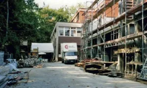1986/1987 wird das Fabrikationsgebäude um eine Etage aufgestockt. Die Erweiterung schafft Raum für ein Fertiglager für die Auslieferung, mehr Ausstellungsraum und zusätzliche Büros.