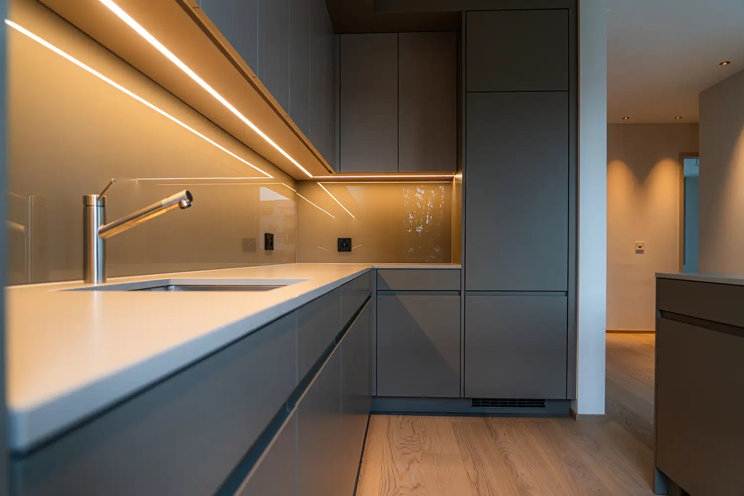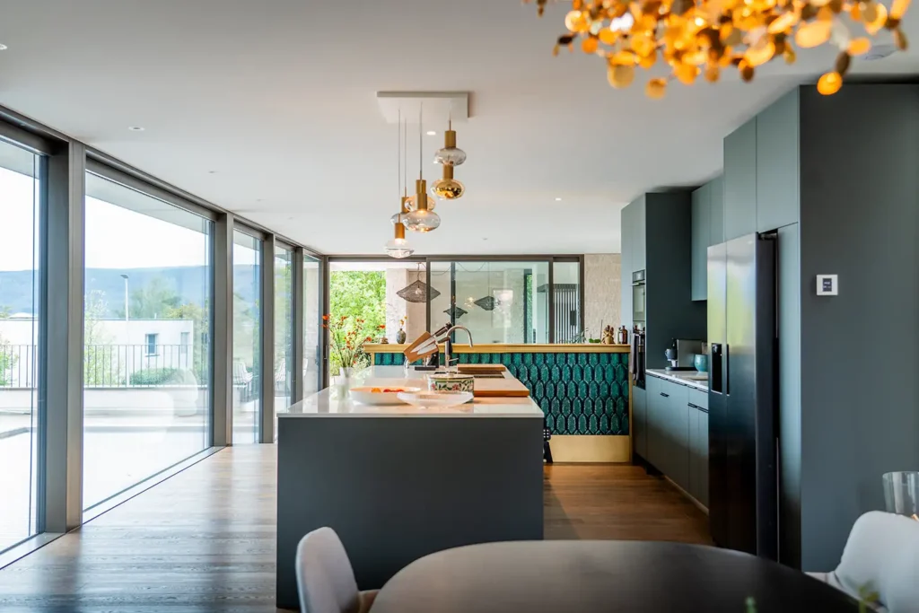 Wir entwickeln ein massgeschneidertes Küchendesign inklusive Layout, Materialien, Farben und Stauraumlösungen.