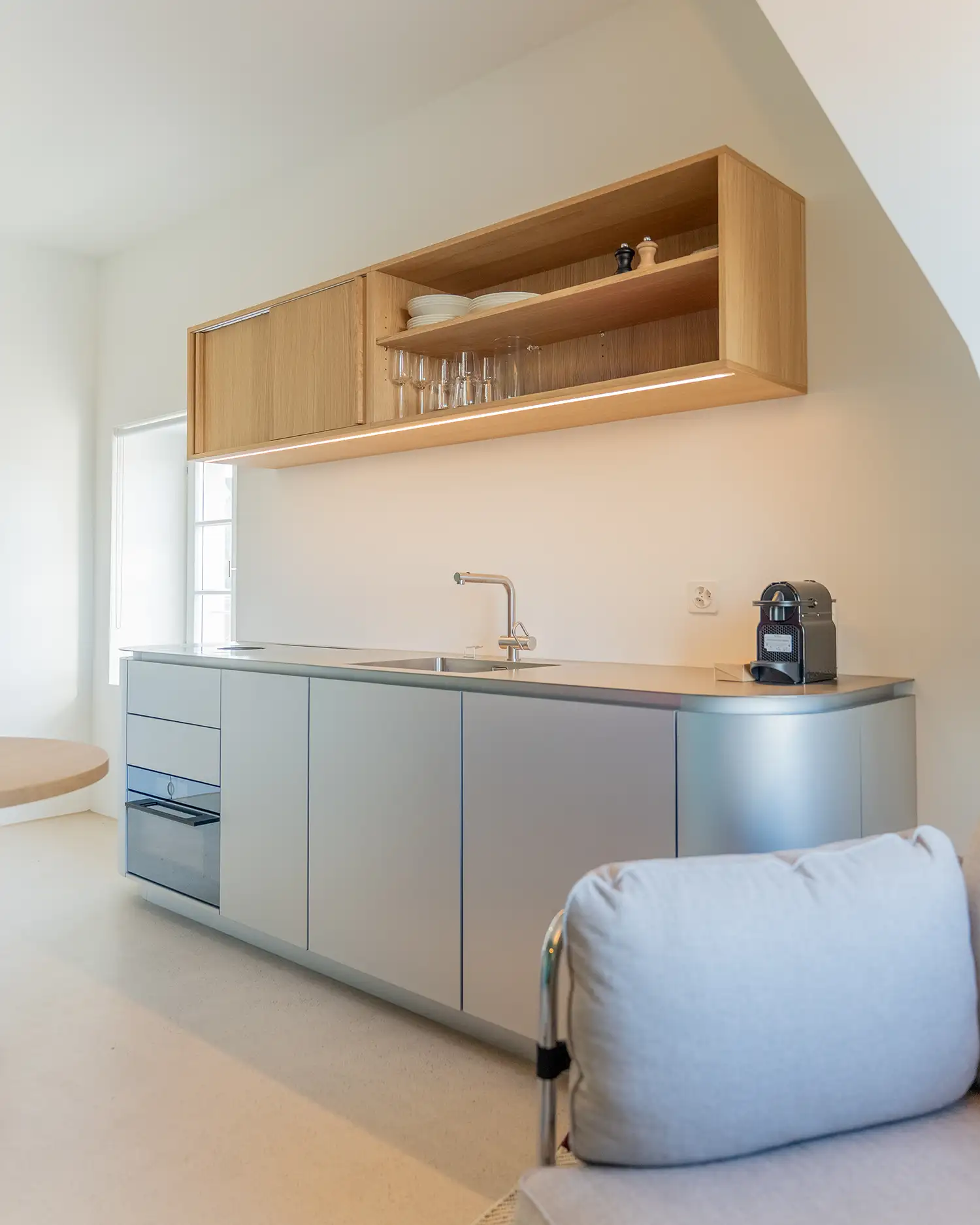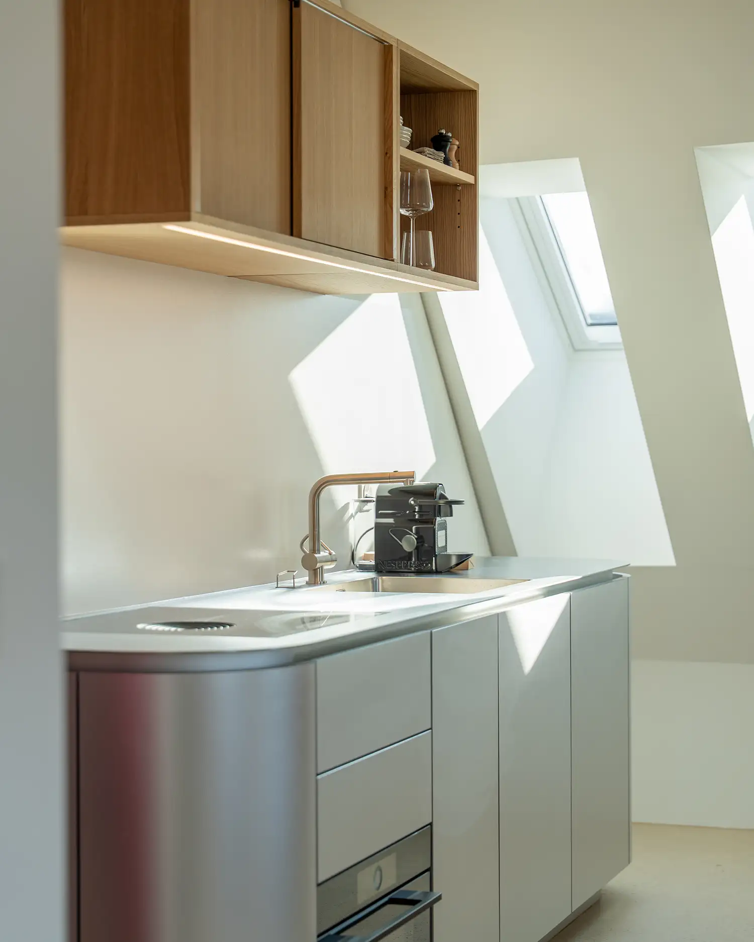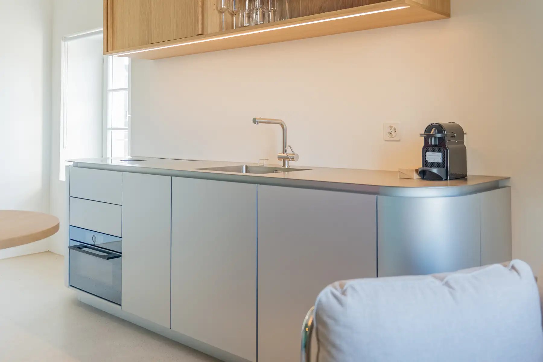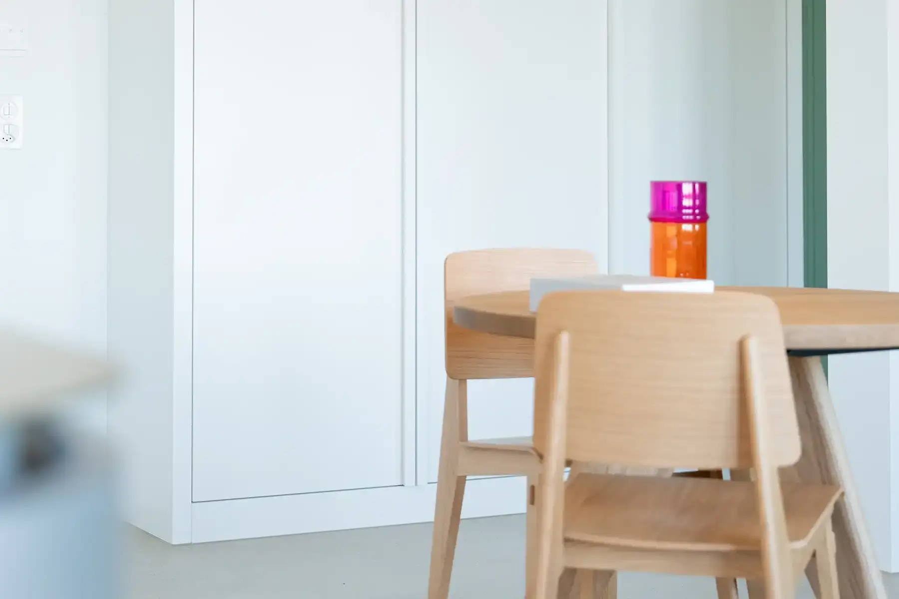 Für das Forschungs- und Architekturbüro F.A.B. wurde ein funktionaler Innenausbau realisiert, der Arbeits- und Aufenthaltsbereiche klar strukturiert und gestalterisch verbindet. Die massgeschneiderte Küchenlösung integriert sich nahtlos in den Raum und kombiniert reduzierte Formen mit hochwertigen Materialien. Abgerundete Kanten, präzise gefertigte Fronten und sorgfältig abgestimmte Details schaffen eine ruhige, professionelle Arbeitsumgebung. Ergänzt wird das Konzept durch individuell ausgeführte Einbauten, die sowohl funktionale Anforderungen als auch gestalterische Ansprüche erfüllen.