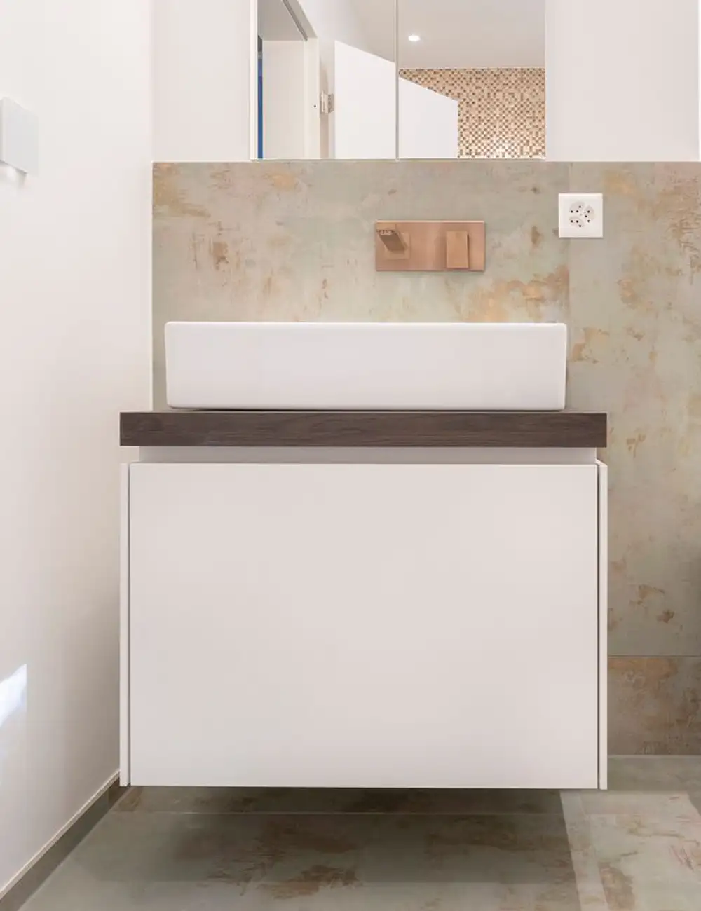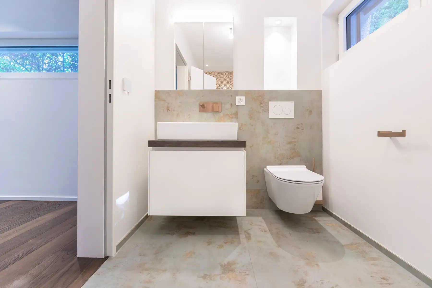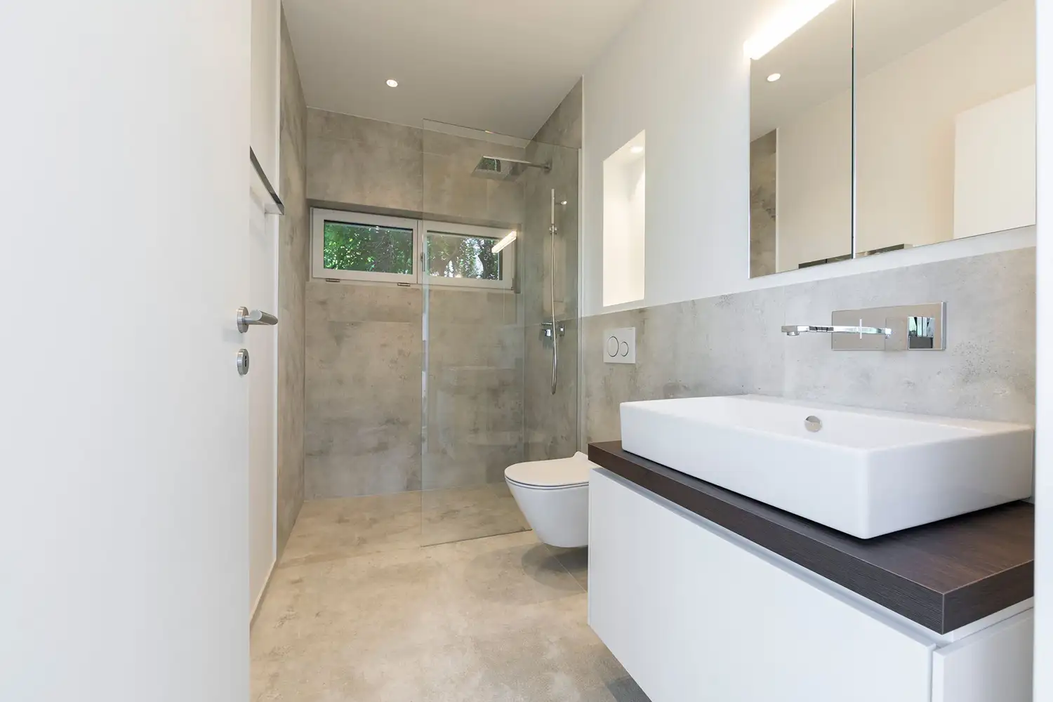 Badmöbel mit klarer Linienführung, schwebendem Waschtisch und fein abgestimmten Materialkontrasten. Die Kombination aus hellen Fronten, markanten Holzelementen und natürlicher Steinoptik schafft eine ruhige, zeitlose Atmosphäre mit eleganter Ausstrahlung.