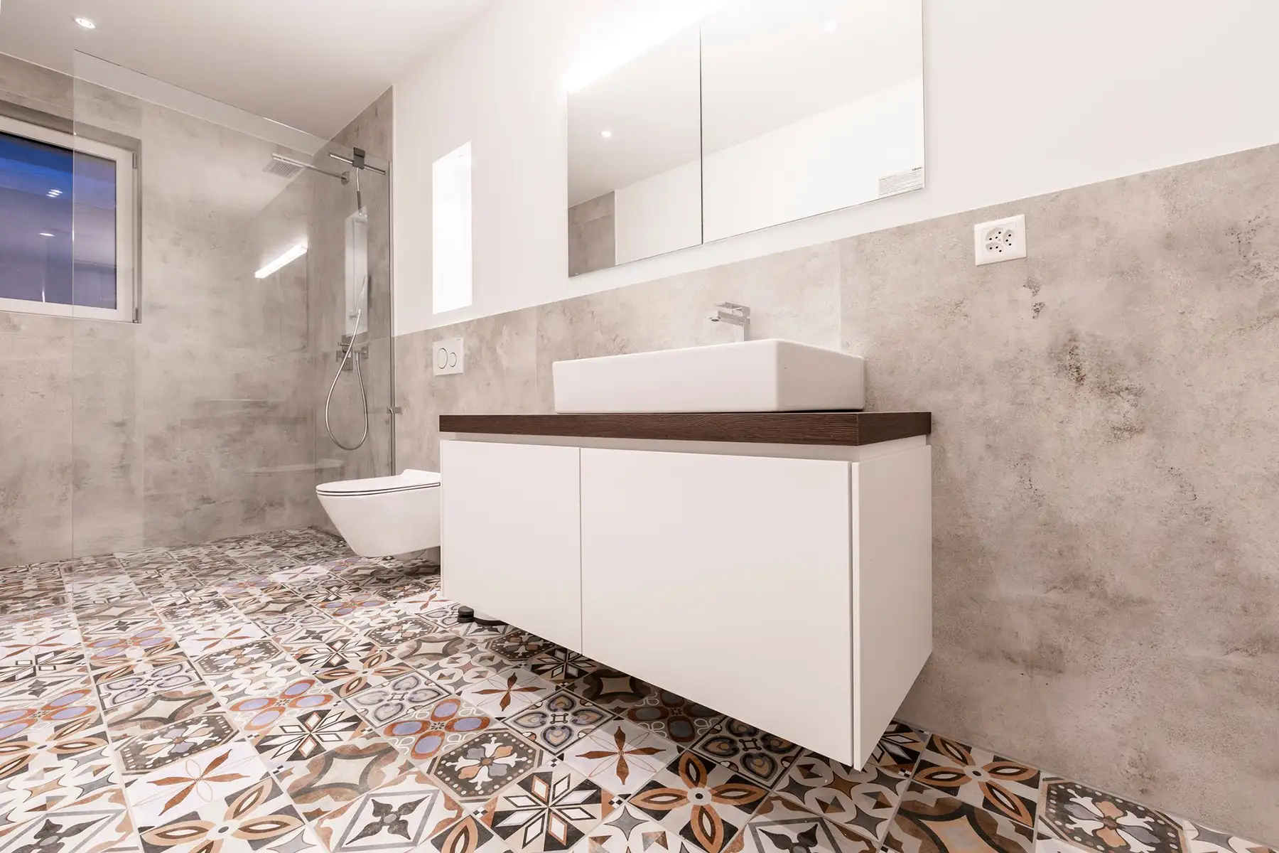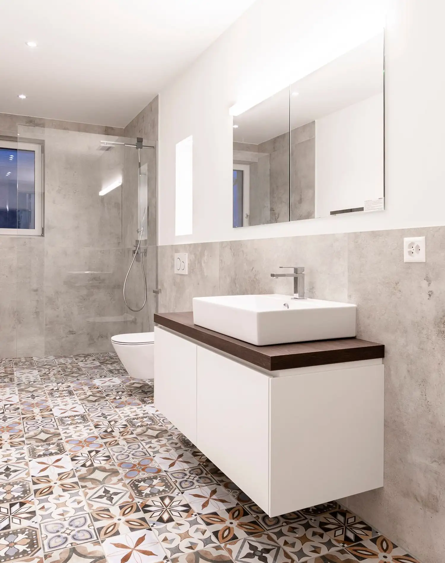 Badmöbel mit klarer Linienführung, schwebendem Waschtisch und ausdrucksstarkem Mosaikboden. Die Kombination aus reduzierten Formen und lebendigen Oberflächen schafft ein spannendes Gleichgewicht zwischen Ruhe und Charakter. Die hellen Fronten lassen den verspielten Boden bewusst wirken und ergeben ein stimmiges Gesamtbild.