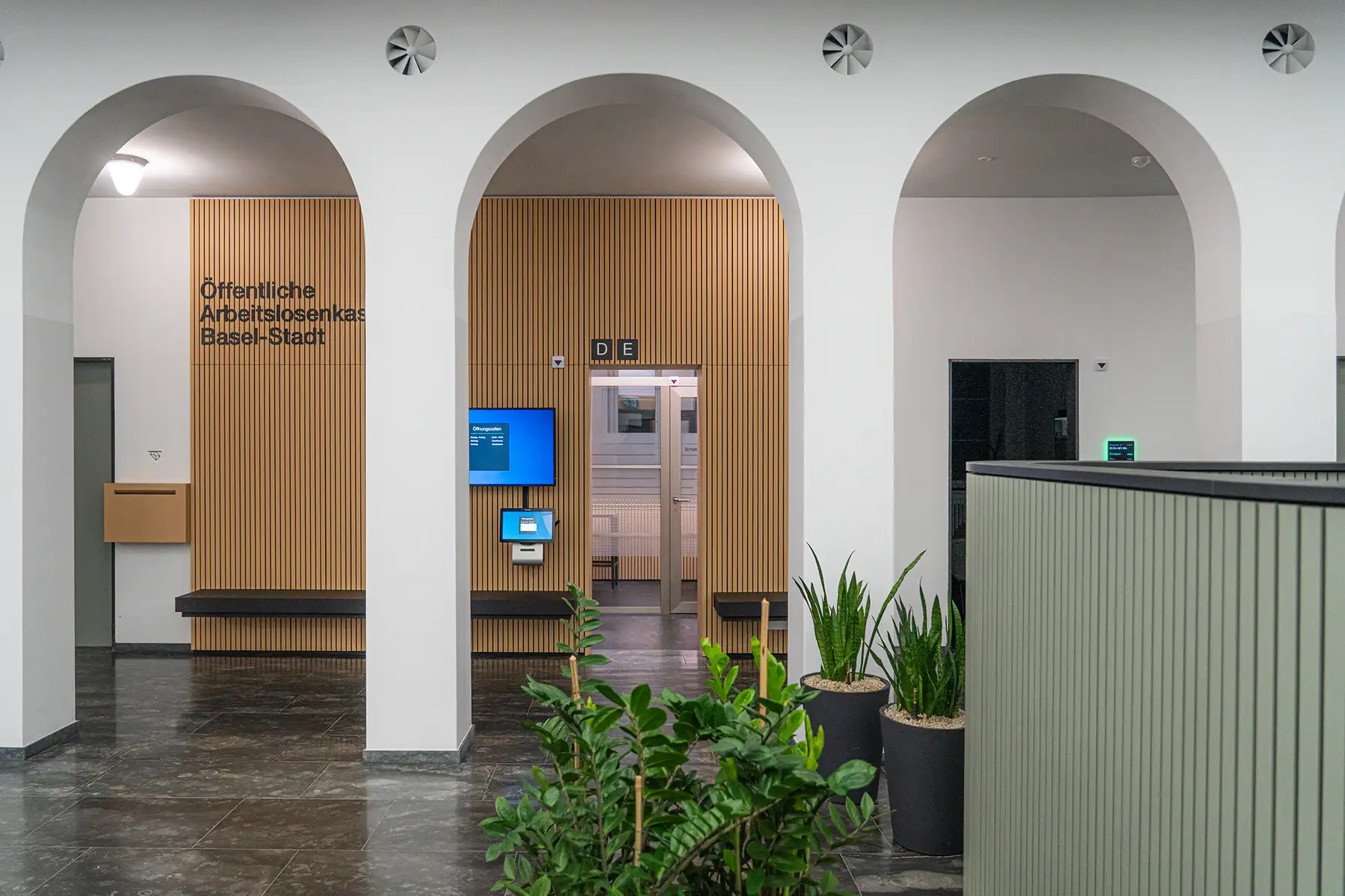 Für die Öffentliche Arbeitslosenkasse Basel-Stadt wurde ein umfassender Innenausbau realisiert, der verschiedene Nutzungsbereiche funktional und gestalterisch miteinander verbindet. Neben dem Empfang entstanden auch Aufenthaltszonen, Arbeitsbereiche sowie massgeschneiderte Einbauten für unterschiedliche Anforderungen im täglichen Betrieb.