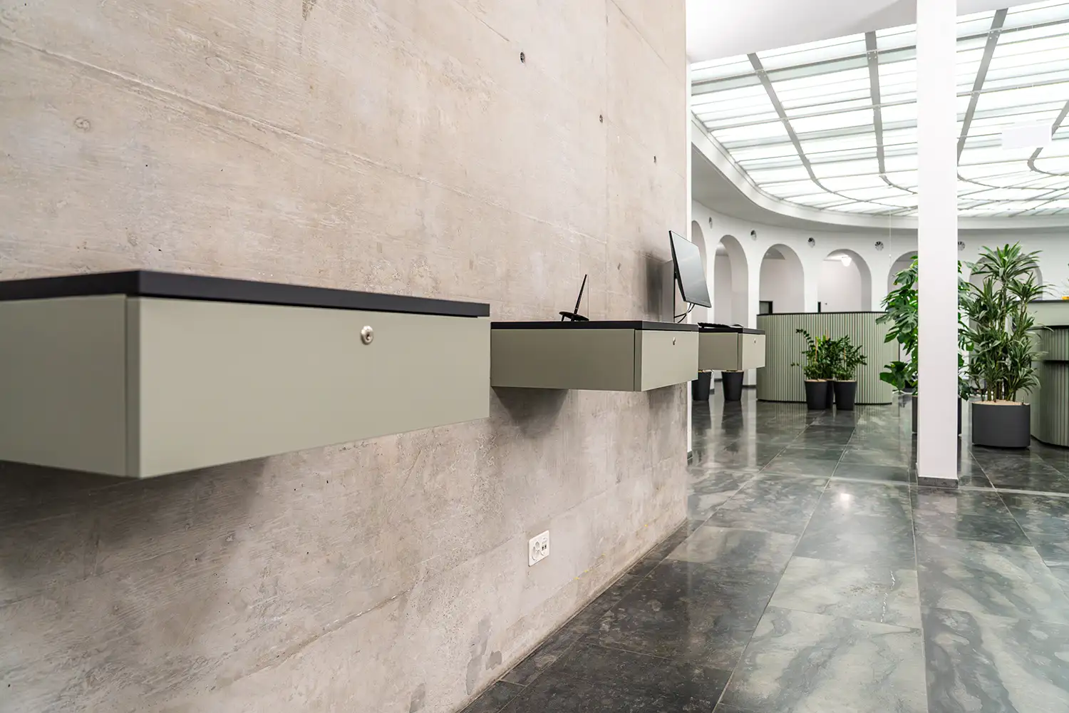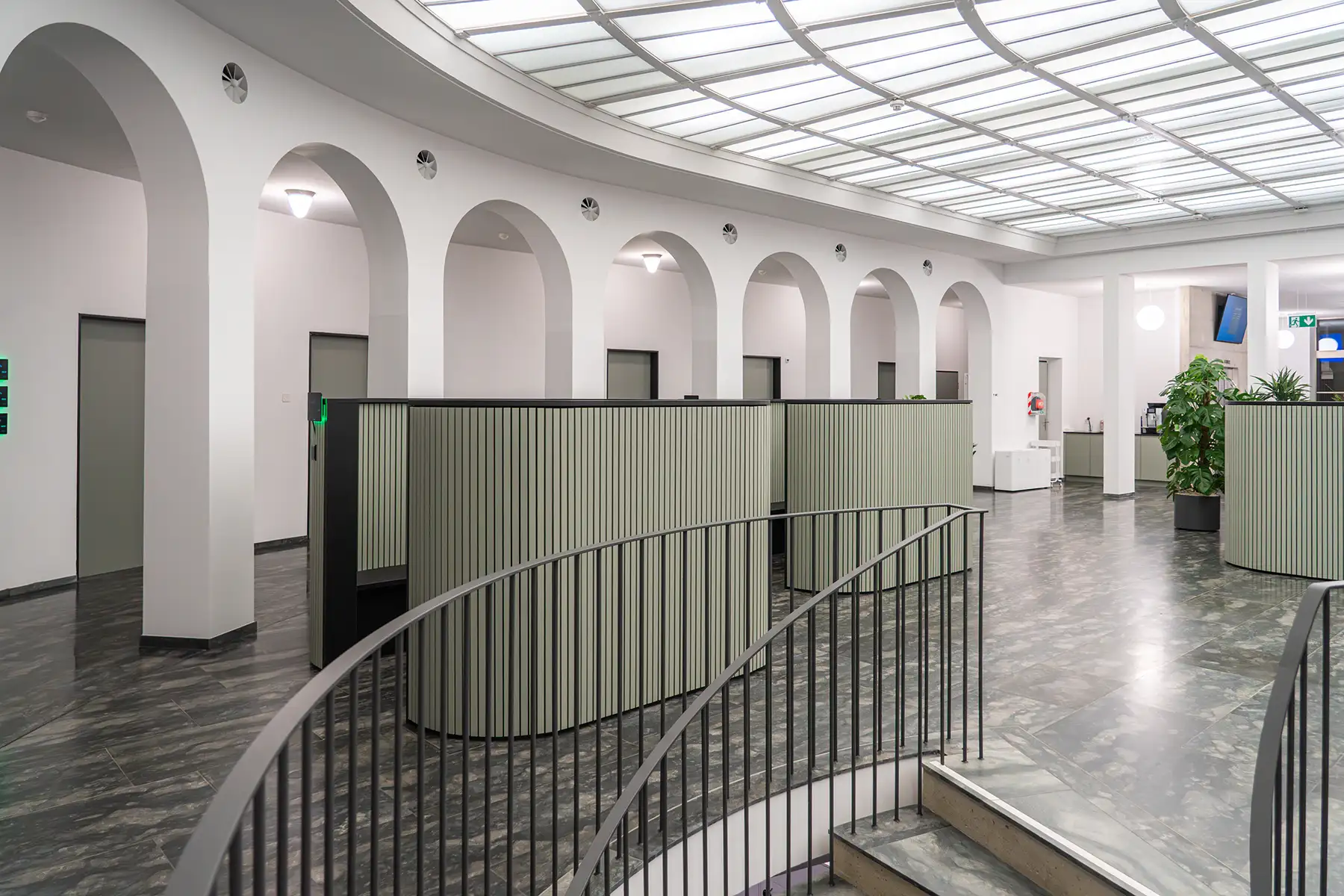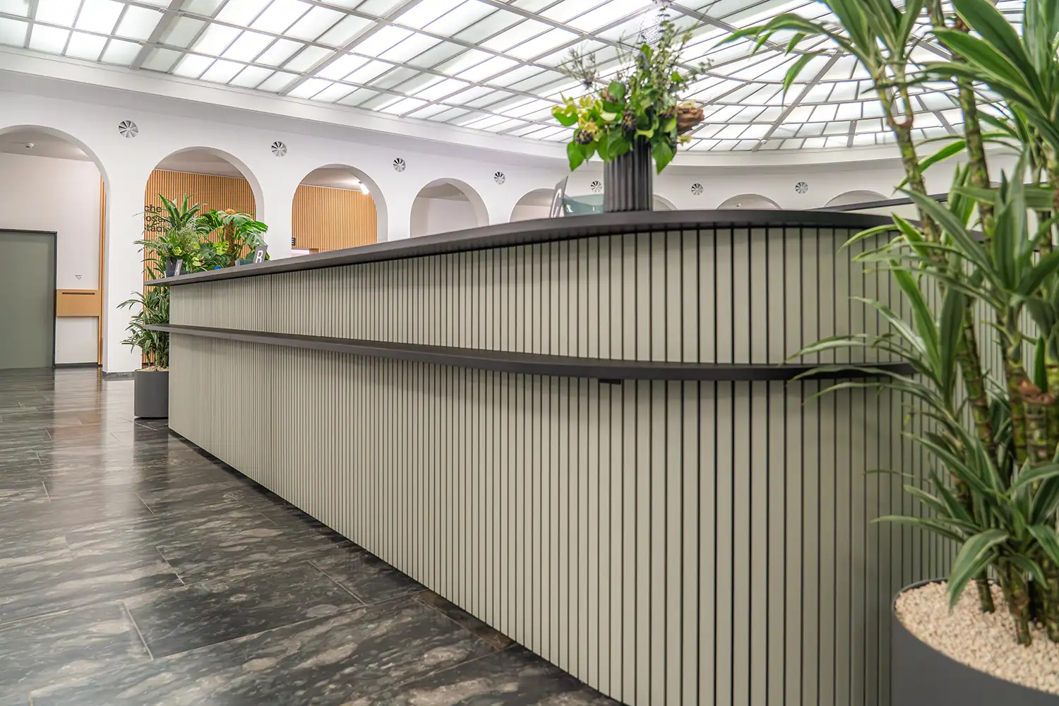Die Gestaltung greift die bestehende Architektur mit ihren Rundbögen und grosszügigen Raumstrukturen auf und übersetzt diese in präzise gefertigte Möbel und Einbauten. Vertikale Strukturen, klare Linien und eine reduzierte Materialwahl schaffen eine ruhige, professionelle Atmosphäre und unterstützen eine intuitive Orientierung im Raum.
