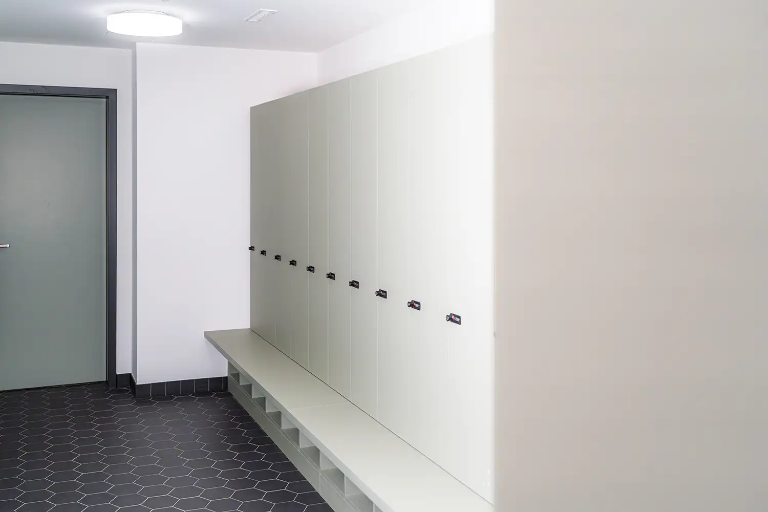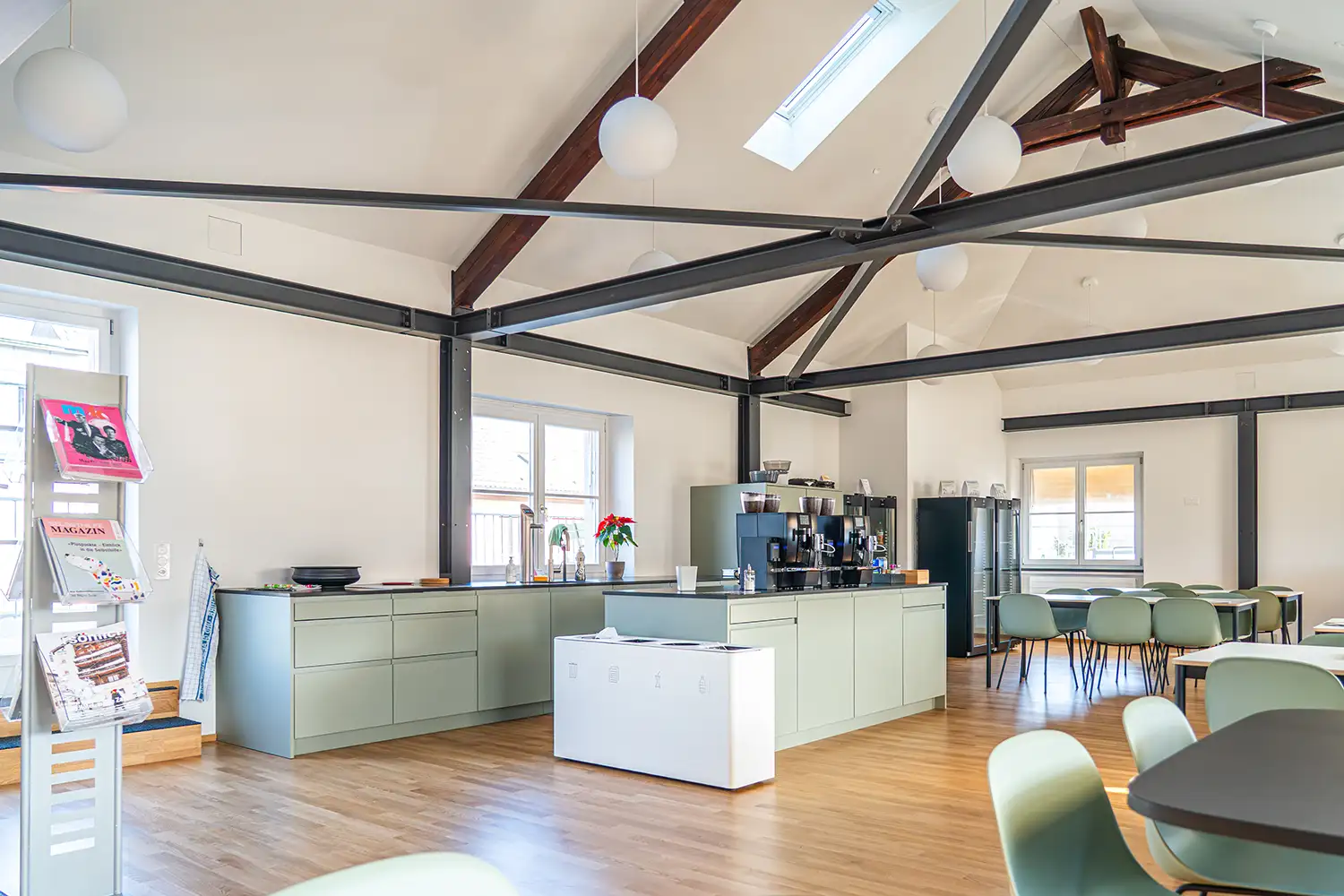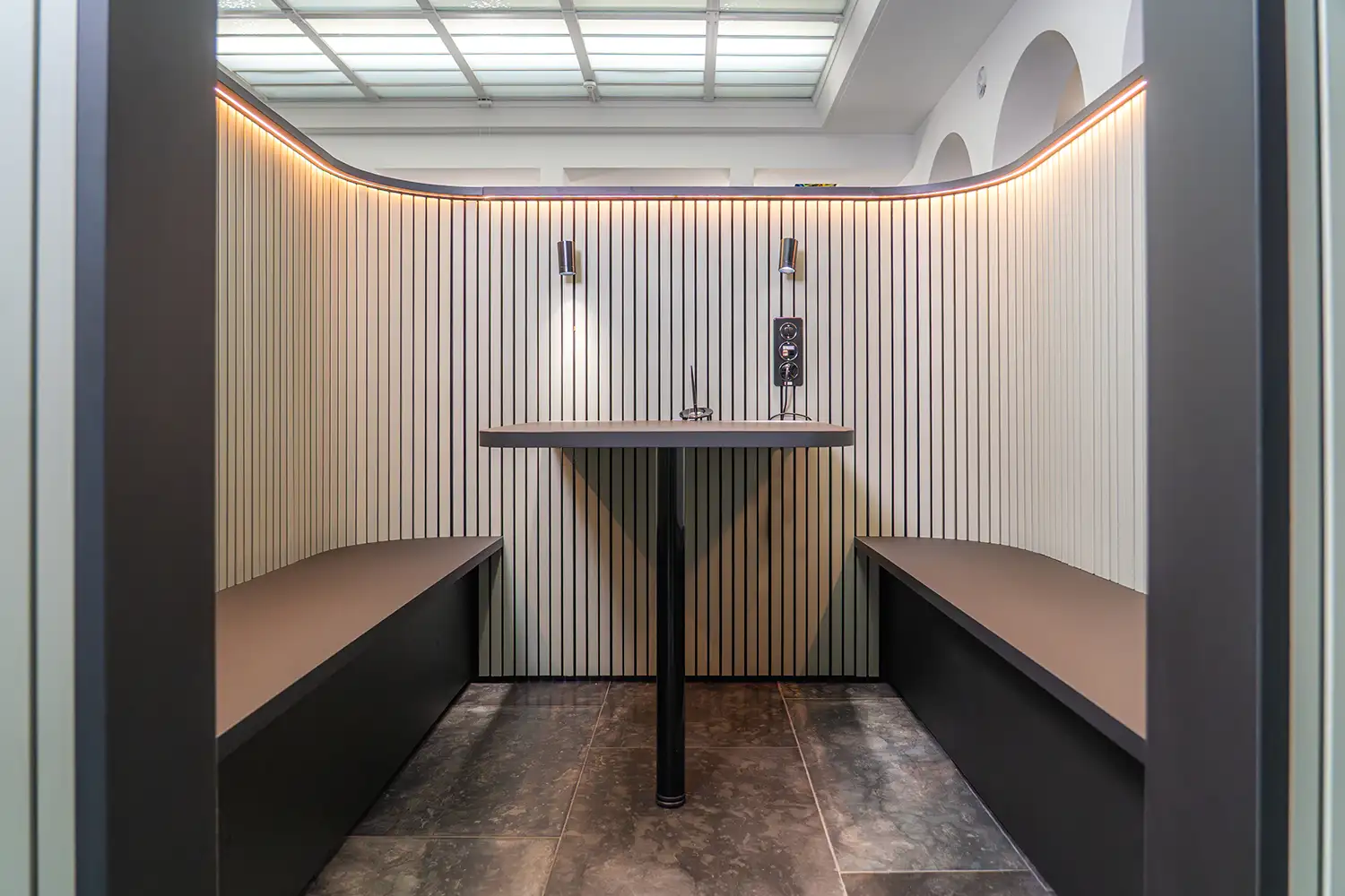 Die Gestaltung greift die bestehende Architektur mit ihren Rundbögen und grosszügigen Raumstrukturen auf und übersetzt diese in präzise gefertigte Möbel und Einbauten. Vertikale Strukturen, klare Linien und eine reduzierte Materialwahl schaffen eine ruhige, professionelle Atmosphäre und unterstützen eine intuitive Orientierung im Raum.