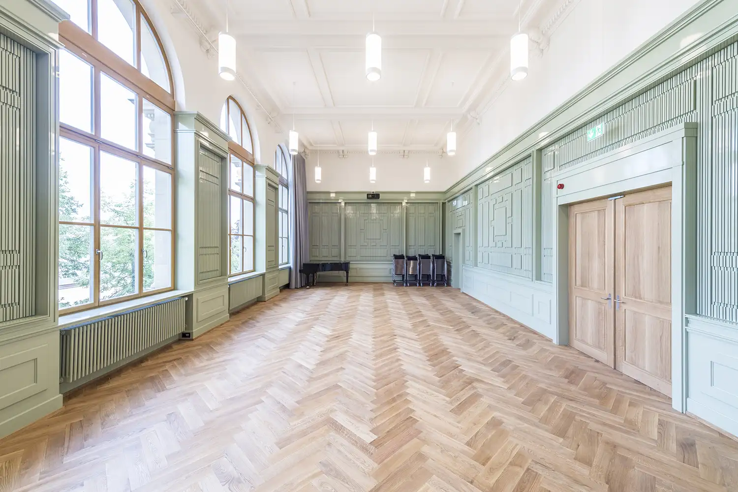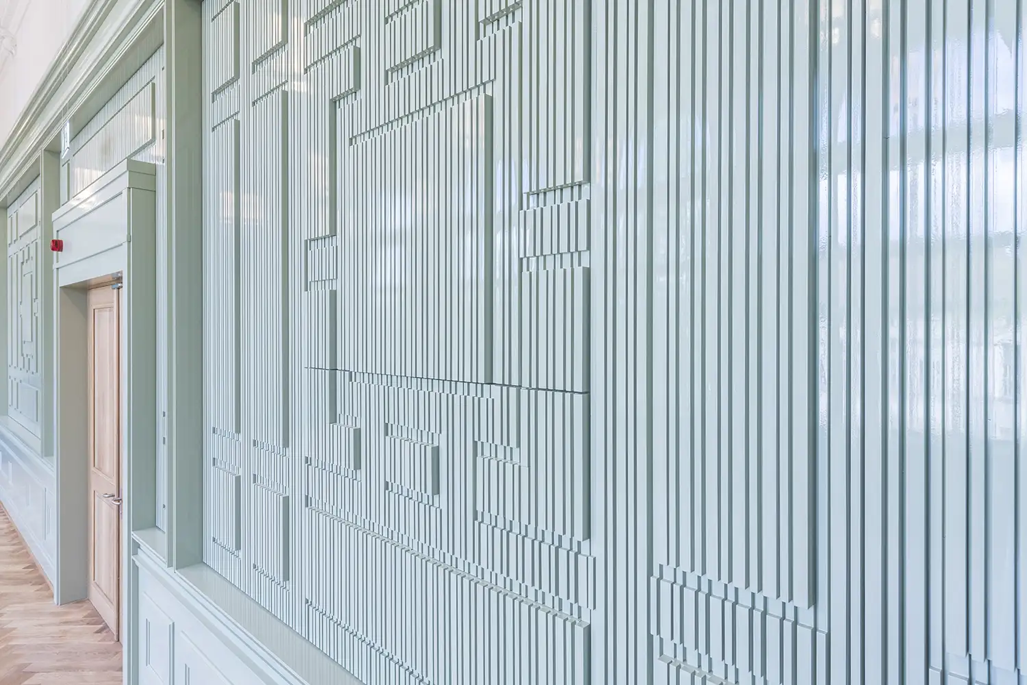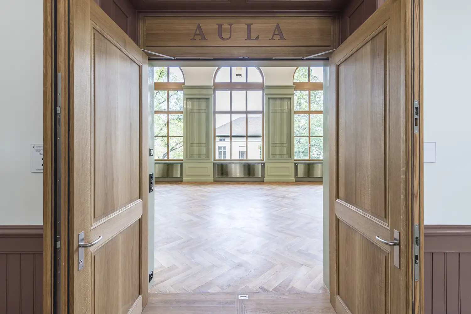 Massgefertigte Wandverkleidung für einen Schulraum mit integrierten Strukturen und präziser Linienführung. Die Gestaltung verbindet Funktionalität mit architektonischem Ausdruck und fügt sich harmonisch in den historischen Raum ein. Robuste Materialien und sorgfältige Ausführung sorgen für Langlebigkeit im täglichen Schulbetrieb.
