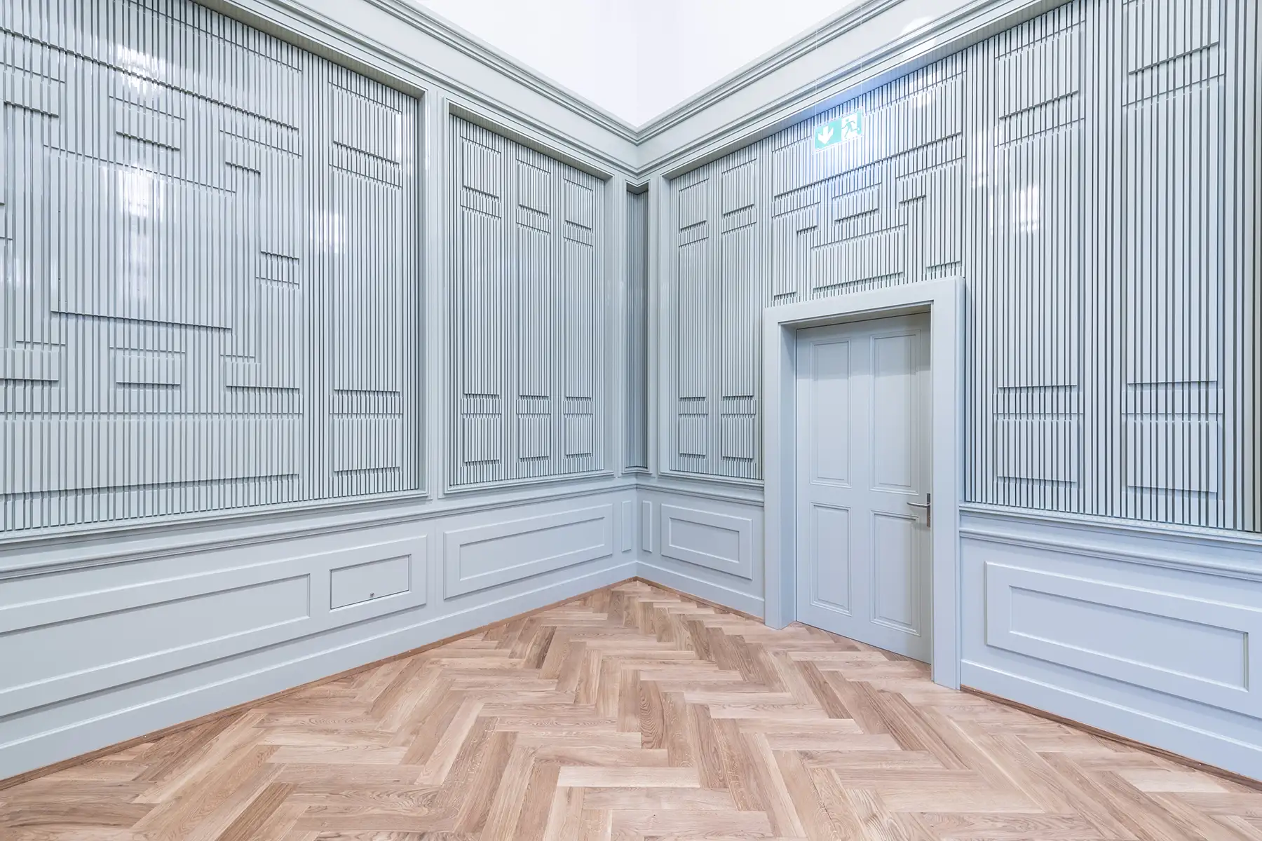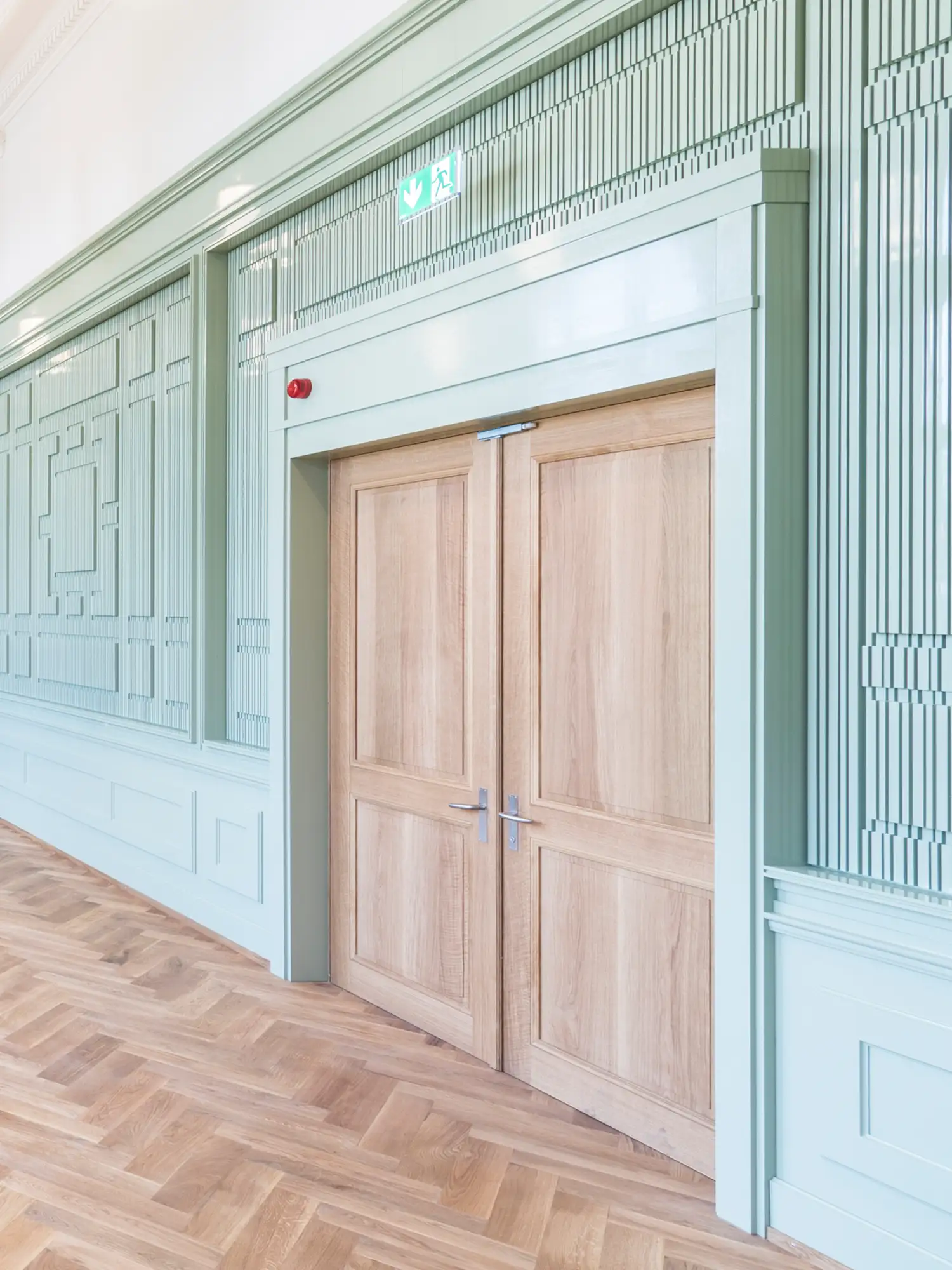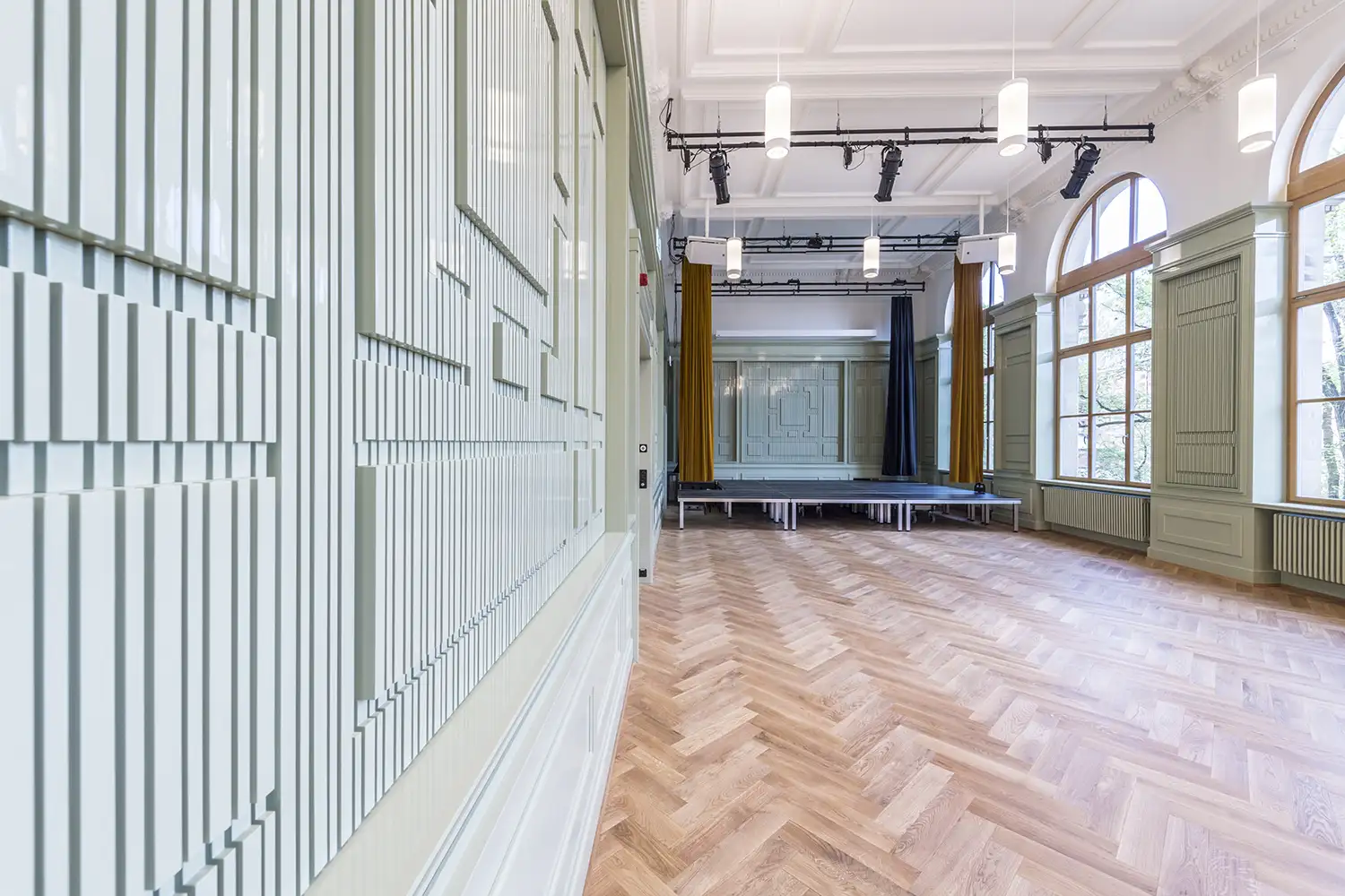 Massgefertigte Wandverkleidung für einen Schulraum mit integrierten Strukturen und präziser Linienführung. Die Gestaltung verbindet Funktionalität mit architektonischem Ausdruck und fügt sich harmonisch in den historischen Raum ein. Robuste Materialien und sorgfältige Ausführung sorgen für Langlebigkeit im täglichen Schulbetrieb.