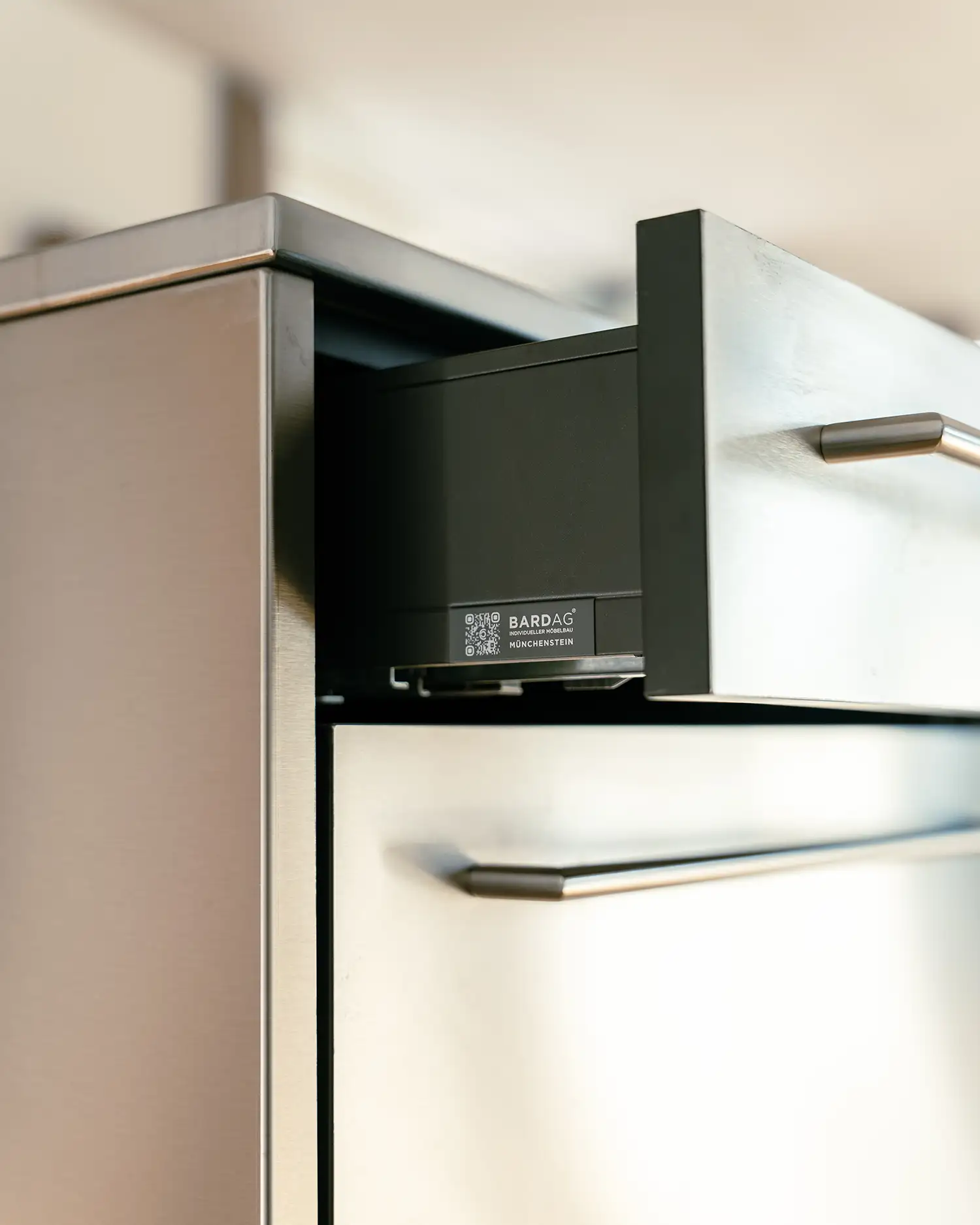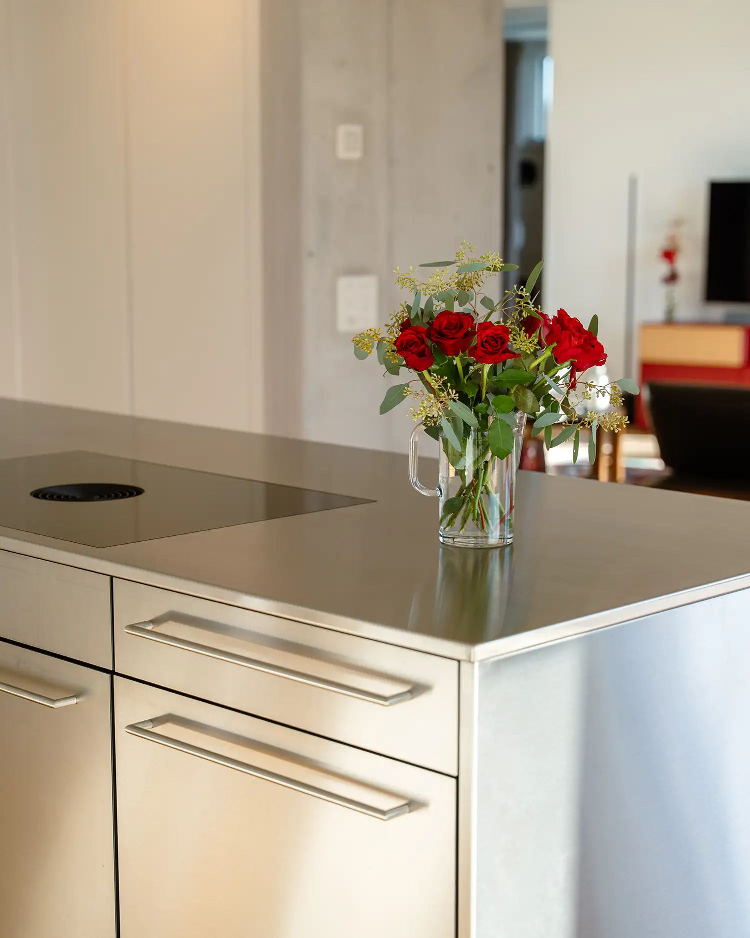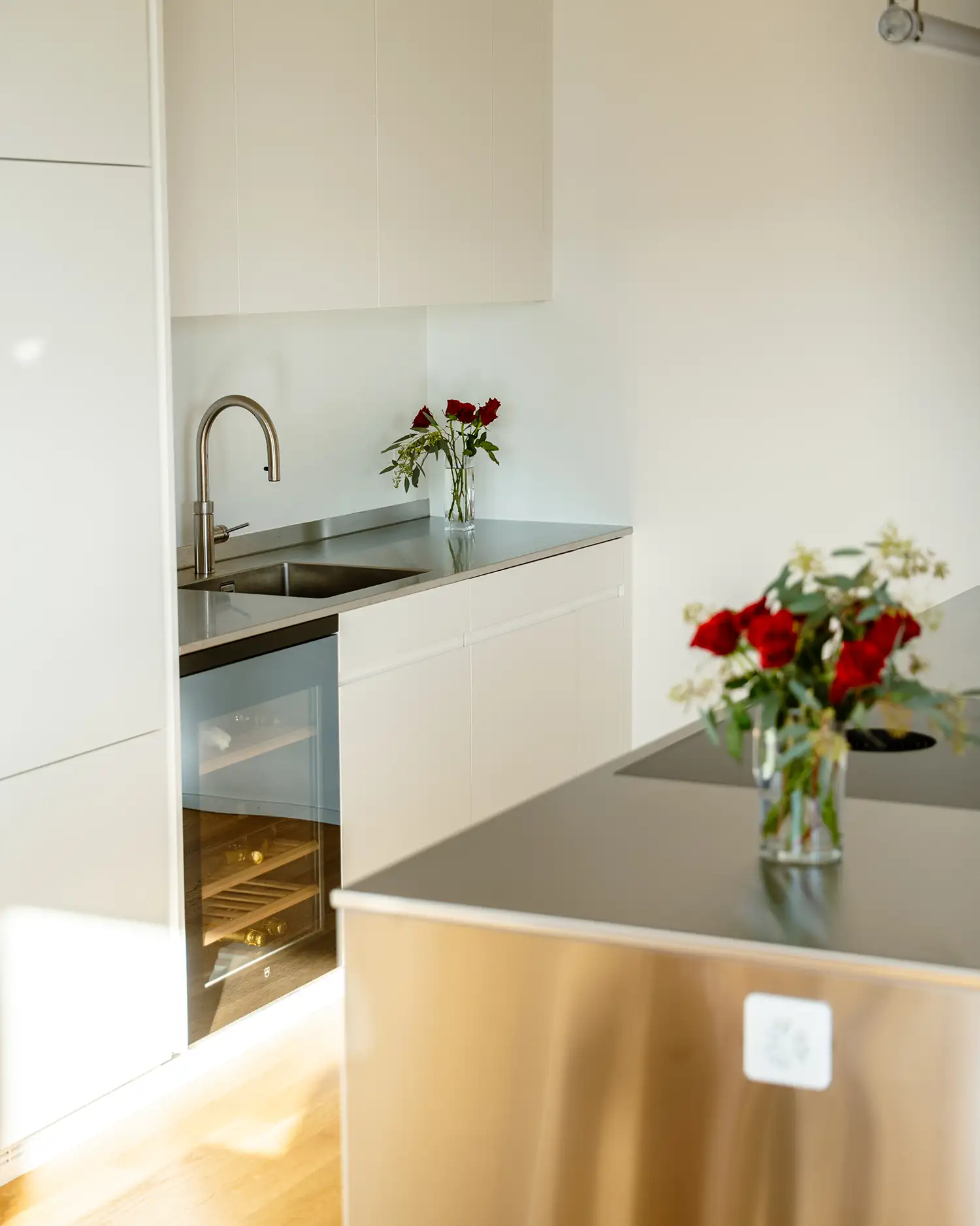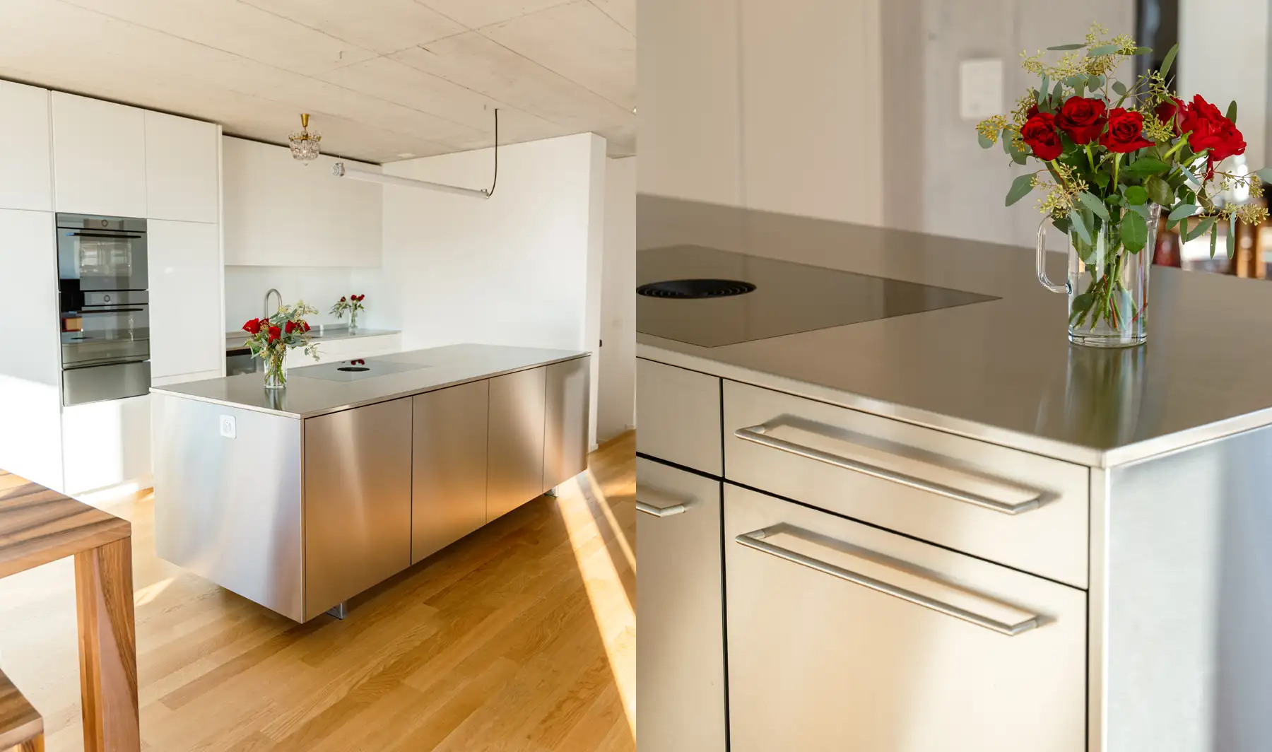 Individuell geplante Küche mit seidenmatten Fronten in Weiss, flächenbündigem Bora-Kochfeld und einer schwebenden Insel auf filigranen Kufenfüssen. Hochwertige V-ZUG Geräte und edle CNS-Details verleihen dem Entwurf eine klare, moderne Ausstrahlung und unterstreichen den hohen Anspruch an Design und Verarbeitung. Präzise umgesetzt und optimal auf den Raum abgestimmt, vereint sie Funktionalität mit einer ruhigen, zeitlosen Ästhetik.