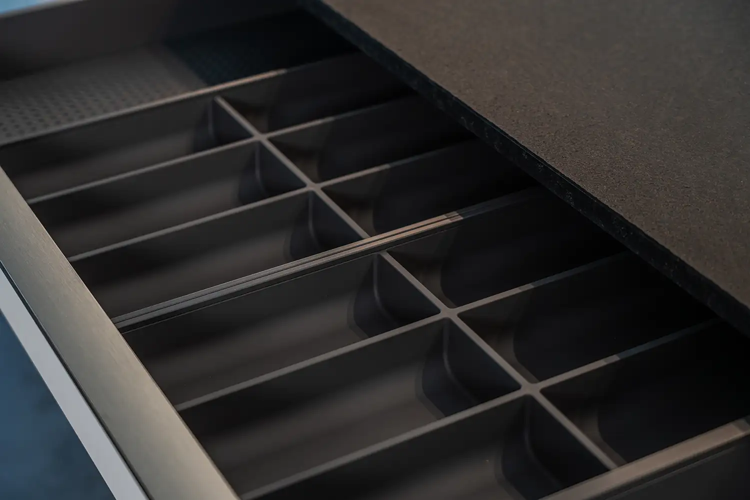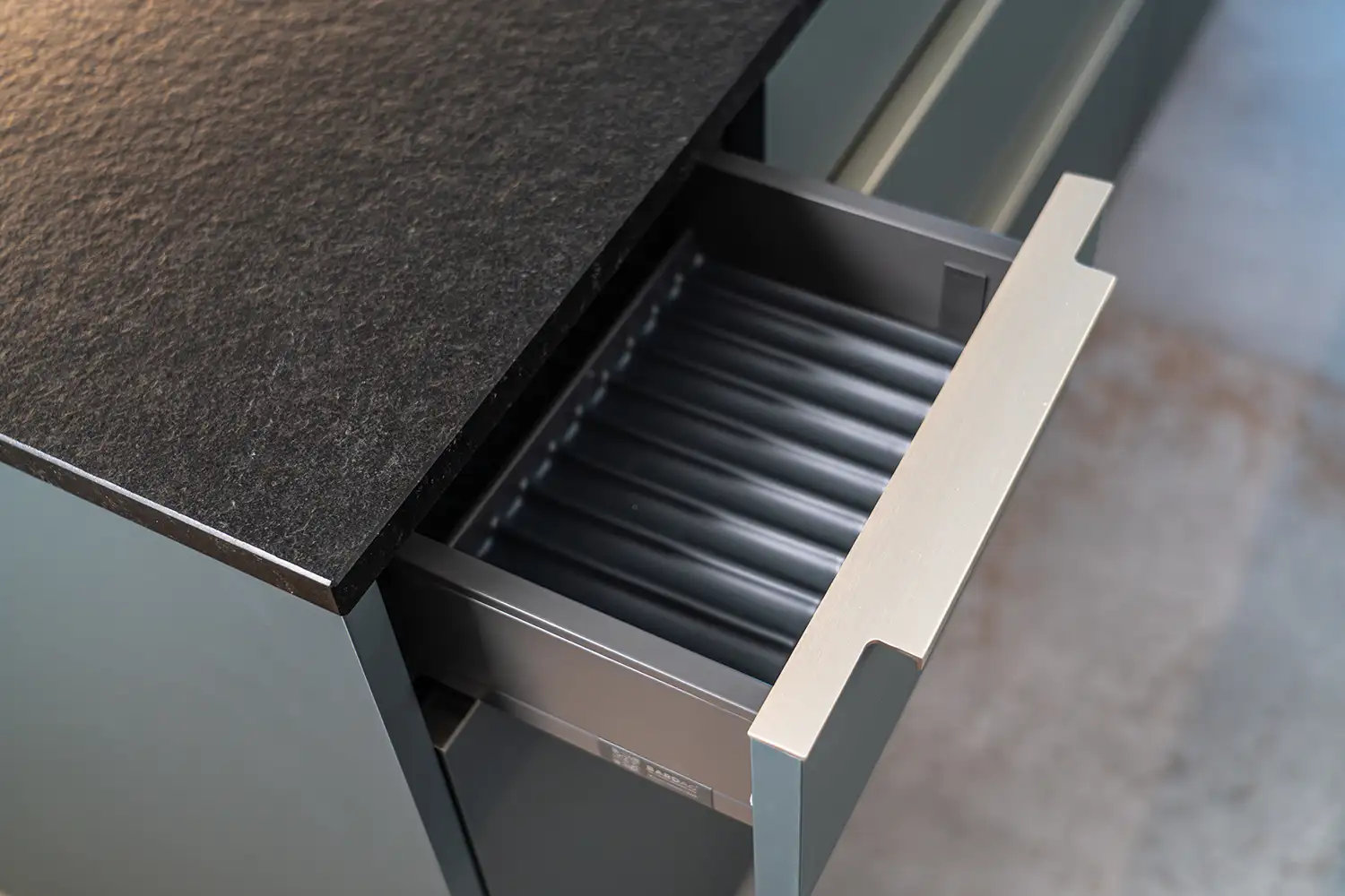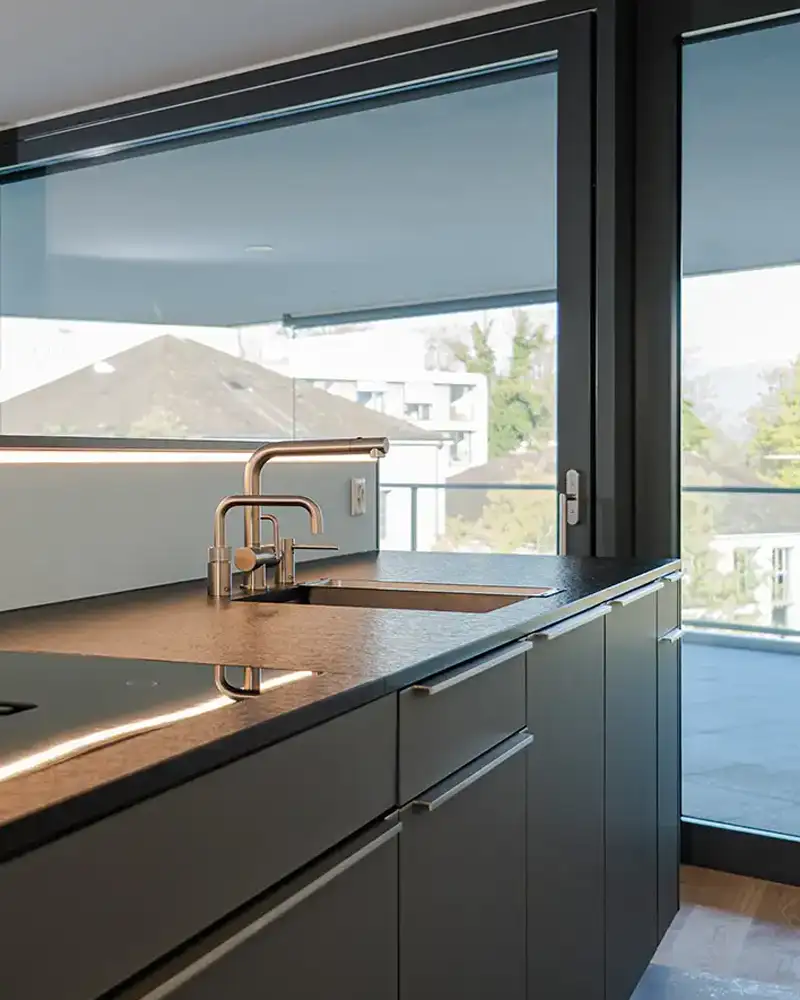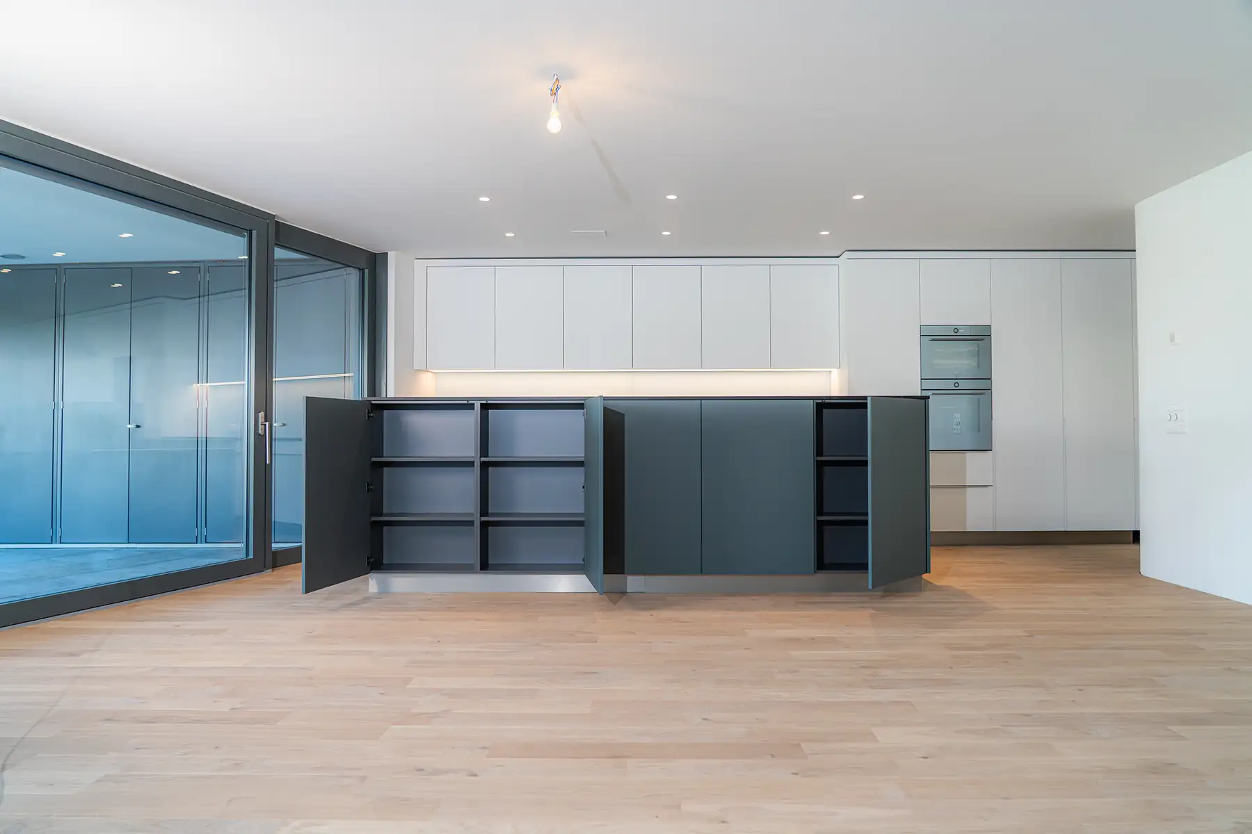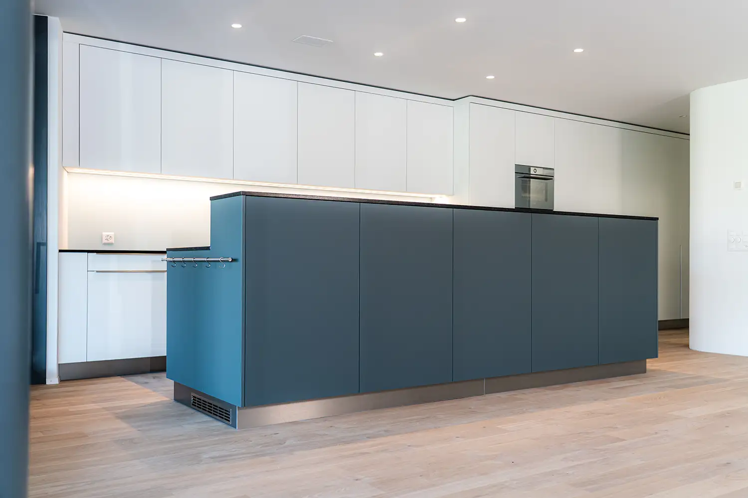 Moderne Küche mit markanter Kochinsel in tiefem Blauton und klar gegliederten Fronten in Weiss. Die reduzierte Formensprache, präzise Linienführung und sorgfältig gewählten Materialien verleihen dem Raum eine ruhige und zugleich starke architektonische Präsenz.