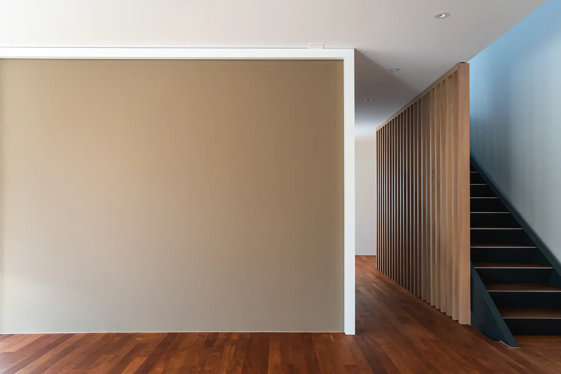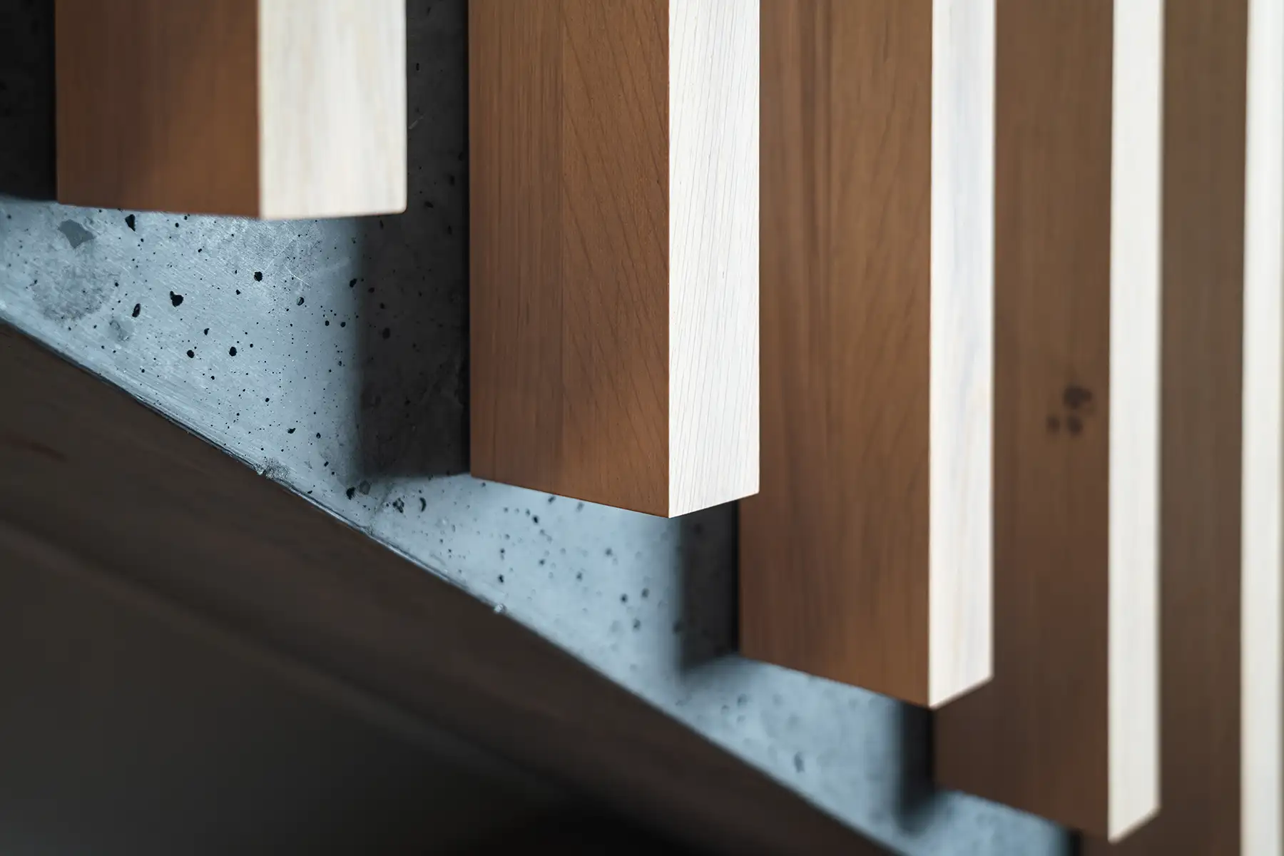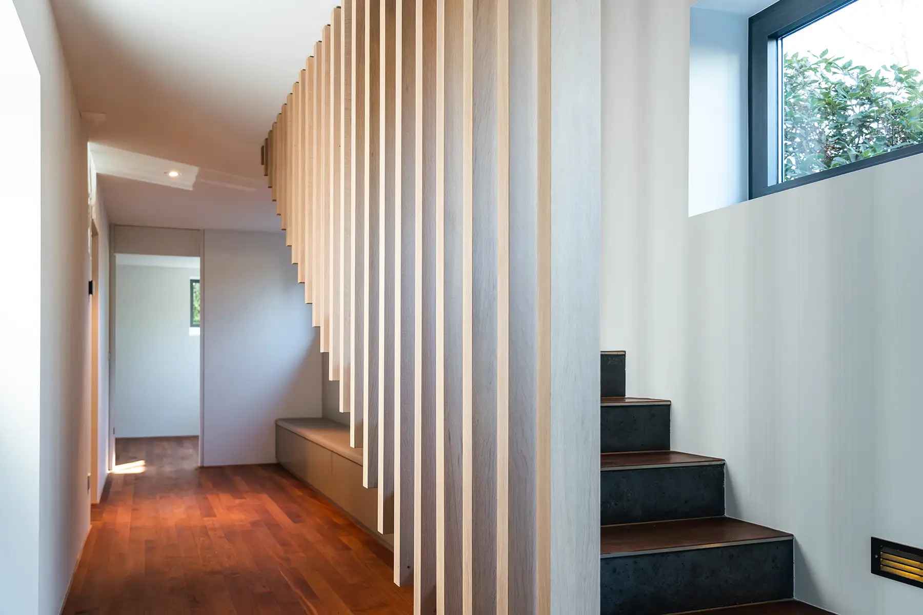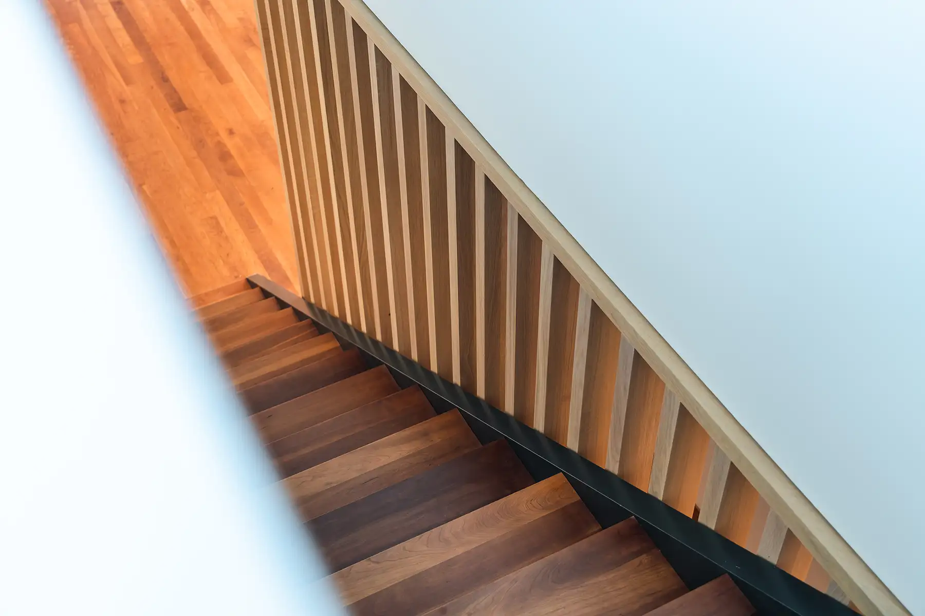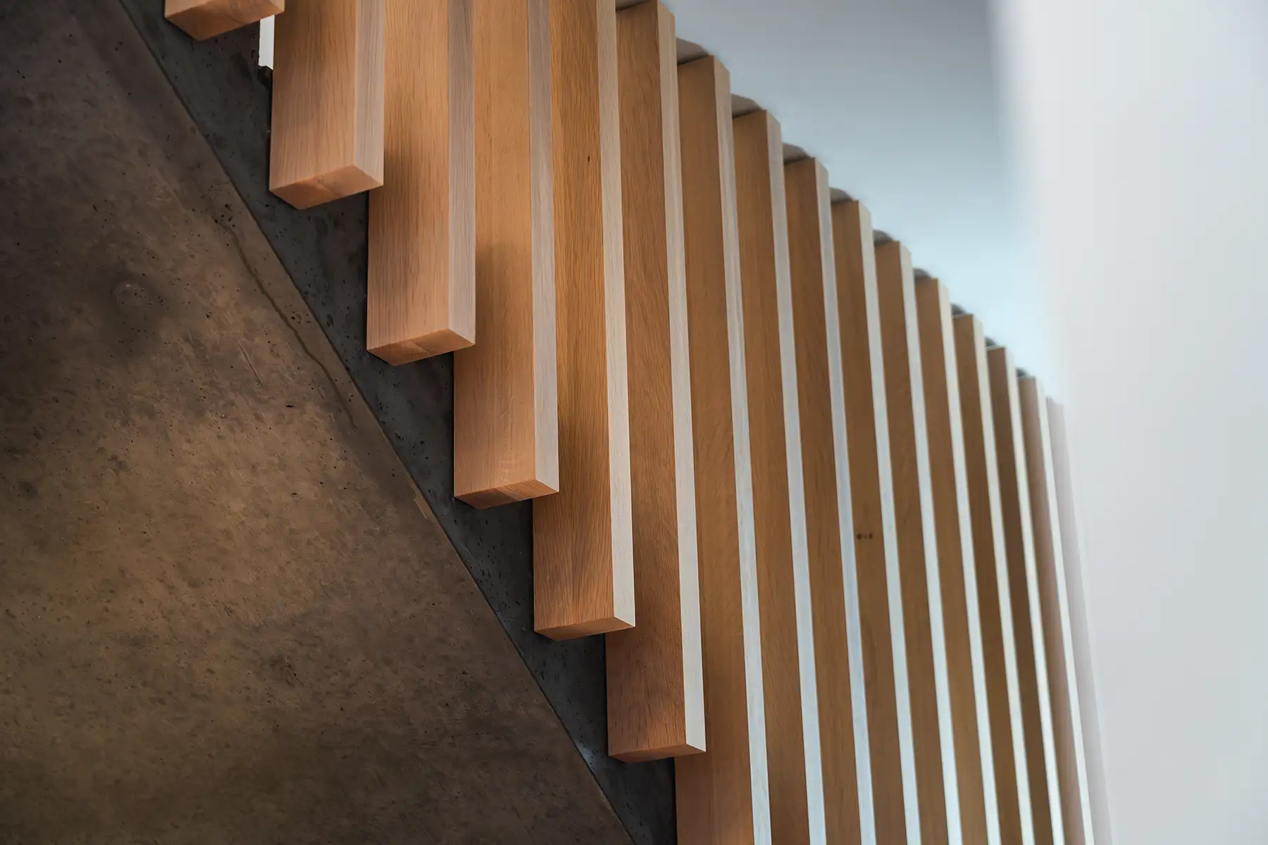 Individuell gestaltetes Treppenelement mit vertikalen Holzlamellen, die Funktion und Raumgestaltung verbinden. Die filigrane Struktur schafft eine leichte, fliessende Wirkung und wird zum prägnanten architektonischen Element im Raum.